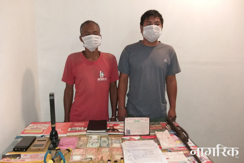 एगरगन एक थान, बमजस्तो देखिने वस्तु पाँच थान, चन्दा उठाउने रसिद प्याड एक थान, पार्टी सदस्यता तीन ठेली, गुलेली एक थान, मोबाइल दुईवटा, टर्च लाइट (विदेशी) एक थान, पावर बैंक एक थान र नगद सात सय ३० रुपैयाँ बरामद गरिएको प्रहरीको भनाइ छ।
