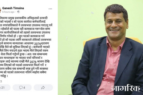 कानुन विपरित आफ्नो तह भन्दा माथिल्लो तहको तलब खाने दमक नगरपालिकाका प्रमुख प्रशासकीय अधिकृत गणेशप्रसाद तिम्सीनाले समेत तक्मा पाएका छन्। संविधान दिवसको अवसरमा उनलाई प्रबल जनसेवा श्री चर्तुथले बिभुषित गरिने घोषणा भएको हाे।