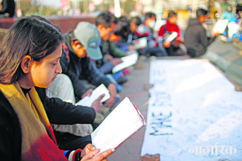 प्रायः आन्दोलन भइरहने राजधानीको माइतीघरमा सोमबार फरक शैलीको विरोध प्रदर्शन आयोजना भएको थियो। विरोध प्रदर्शनीमा सहभागी करिब तीन दर्जन प्रदर्शनकारीहरू विभिन्न विषयका पुस्तकहरू पढिरहेका देखिन्थे।