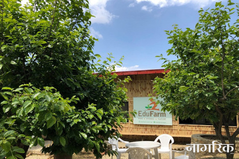 सबैभन्दामाथि पाहुनालाई स्वागत र बासस्थानको लागि निर्माण गरिएका साना साना बाँसका कटेल, त्यसको तल पशुपक्षीका लागि छुट्टै पशुपक्षी र किरा फट्याँग्रा गाउँ अनि गाई भैंसीका लागि लगाइएको घाँस र आउने पहुनाको लागि तरकारी लगाउने जमिन ललिपुरको एकान्तकुनाबाट सात किलोमिटर टाढा रहेको इडुफार्मको दृश्य हो यो।