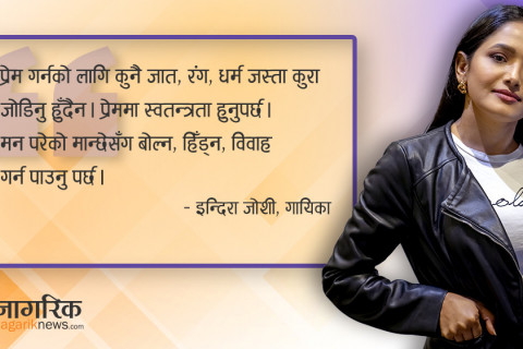 नेपाली सांगीतिक क्षेत्रमा चिरपरिचित नाम हो– इन्दिरा जोशी। फरक पहिचान बनाउन सफल उनले देश–विदेशका कैयौं स्थानमा आफ्ना सिर्जना र कला प्रस्तुत गरिसकेकी छिन्। झण्डै डेढ दशकदेखि गीत–संगीतमा क्रियाशील गायिका जोशीको ‘चौबन्दी चोली अनि रातो घाँगरा’, ‘उध्रेको चोली’, ‘मोटरसाइकलमा’ ठूली’ लगायत दर्जनौं हिट गीत गाइसकेकी छिन।