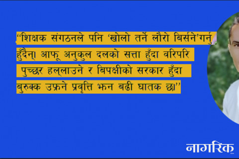 शिक्षक संगठनले पनि ‘खोलो तर्ने लौरो बिर्सने’ गर्नु हुँदैन्। आफू अनुकुल दलको सत्ता हुँदा वरिपरि पुच्छर हल्लाउने र बिपक्षीको सरकार हुँदा बुरुक्क उफ्रने प्रवृत्ति झन बढी घातक छ।
