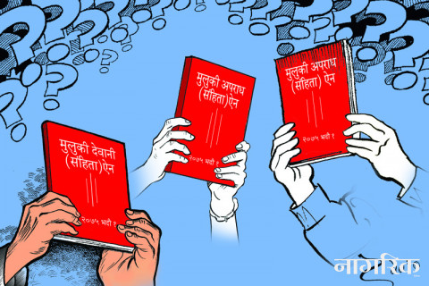 २०७५ भदौ १ गतेदेखि प्रारम्भ हुनेछ भनी प्रस्तावित मुलुकी देवानी (संहिता) ऐन, मुलुकी देवानी कार्यविधि (संहिता) ऐन, मुलुकी अपराध (संहिता) ऐन, मुलुकी फौजदारी कार्यविधि (संहिता) ऐन, र फौजदारी कसूर (सजाय निर्धारण तथा कार्यान्वयन) ऐनहरू सार्वजनिक भएका छन्।