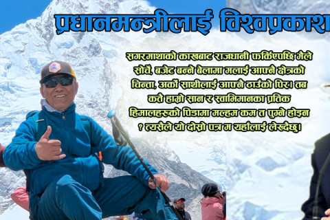 विचार प्रधानमन्त्रीलाई विश्वप्रकाशको दोस्रो पत्र: बजेटमा हिमाल देख्न पाइयोस् बजेट बनाउन सुरु गर्दै गर्दा अर्थमन्त्री जीले आफ्नो कार्यकक्षमा दैनिक सयौँ मानिस भेट्नु भयो । ती भित्र न कलंकीका भरिया पुगे, न कालापथ्थरका । विश्वप्रकाश शर्मा १३ जेष्ठ २०८२ मंगलबार ७ मिनेट पाठ Facebook Twitter Linkedin