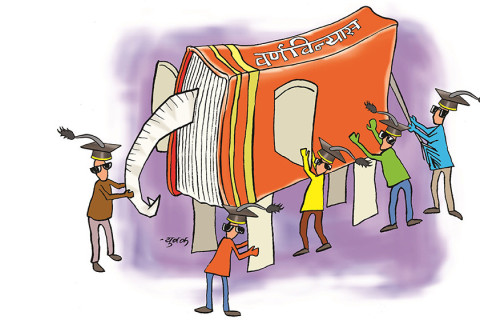 वर्णविन्यास बिगार्ने सर्वोच्च उद्देश्य बोकेका प्रा.डा. पदधारी विद्वान्–विदुषीहरूले नेपाली शब्दको वर्णविन्यास आफ्नै गोजीको सामानजस्तै ठानी जति बेला पनि, जे पनि गर्न सक्ने ठानेर अभूतपूर्व ३५ अक्षरी वर्णमाला बनाएका रहेछन्।
