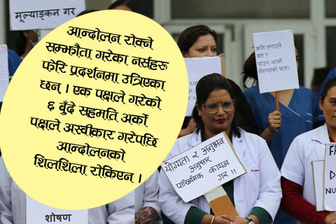 केही असन्तुष्ट नर्सले आइतबार बिहानै नेपाल नर्सिङ्ग एशोसिएसनका अध्यक्ष चन्द्रकला शर्माको कार्यकक्षमा घेराउ तथा नाराबाजी गरेपछि नर्सिङ्ग एशोसिएसनले फिर्ता लिएको आन्दोलन पुनः सुरु भएको छ ।