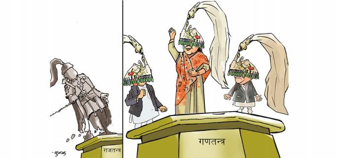 सर्वसाधारण जनताको भान्सामा, पिँढीमा, छिँडीमा, अगेँनामा गणतन्त्र पुगेको छैन तर सत्तारुढ पार्टीका ठूला नेताको भने रछानसम्म पनि पुगेको छ।