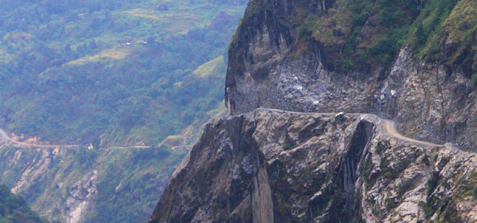 घन, छिनो र सावेलले ठूलाठूला चट्टान खोपेर बनाइएको सडक। तल हेर्दा आँङ नै सिरिङ हुने भीर, त्यो भन्दा तल रिँगटा लाग्ने गरी गड्गडाउँदै बगिरहेको मर्स्याङ्दी नदी। माथि उस्तै अजङ्गको चट्टानी पहरो। यो अवस्था हिमालपारीको जिल्ला मनाङ जाने सडकको हो।