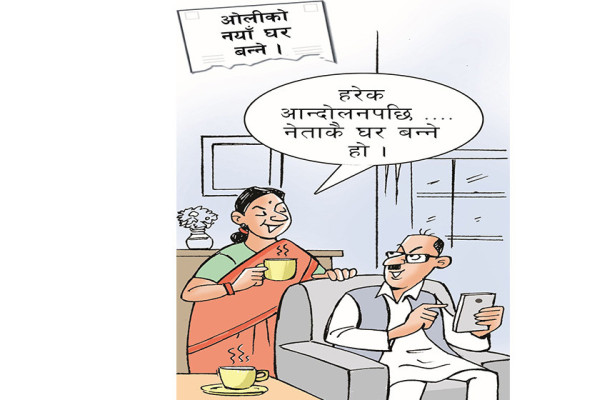 आजकाे कार्टुनले ‘ओलीकाे नयाँ घर बन्ने। हरेक आन्दाेलनपछि...नेताकै घर बन्ने हाे’ भनेर सामयिक अवस्थाविरुद्ध तीव्र व्यङ्ग्य गरेकाे छ।