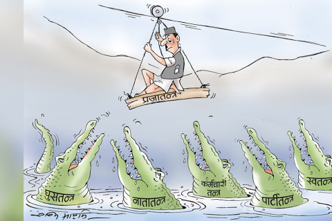आजकाे कार्टुनले देशकाे विद्यमान परिस्थितिकाे सुन्दर चित्रण गरेकाे छ। यहाँ अनेक तिकडम, जालझेल र खिचातानी फस्टाएकाे छ।