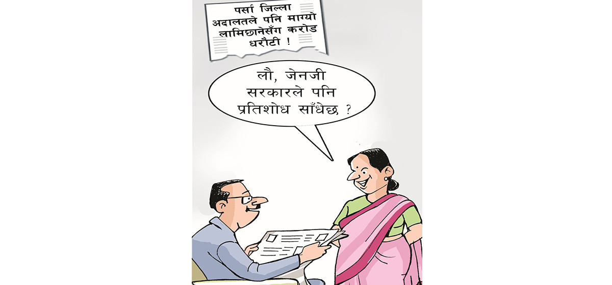 आजकाे कार्टुनमा ‘पर्सा जिल्ला अदालतले पनि माग्याे लामिछानेसँग कराेड धराैटी! लाै, जेन-जी सरकारले पनि प्रतिशाेध साँधेछ?’ भनेर सामयिक विकृतिकाे व्यङ्ग्य गरेकाे छ।
