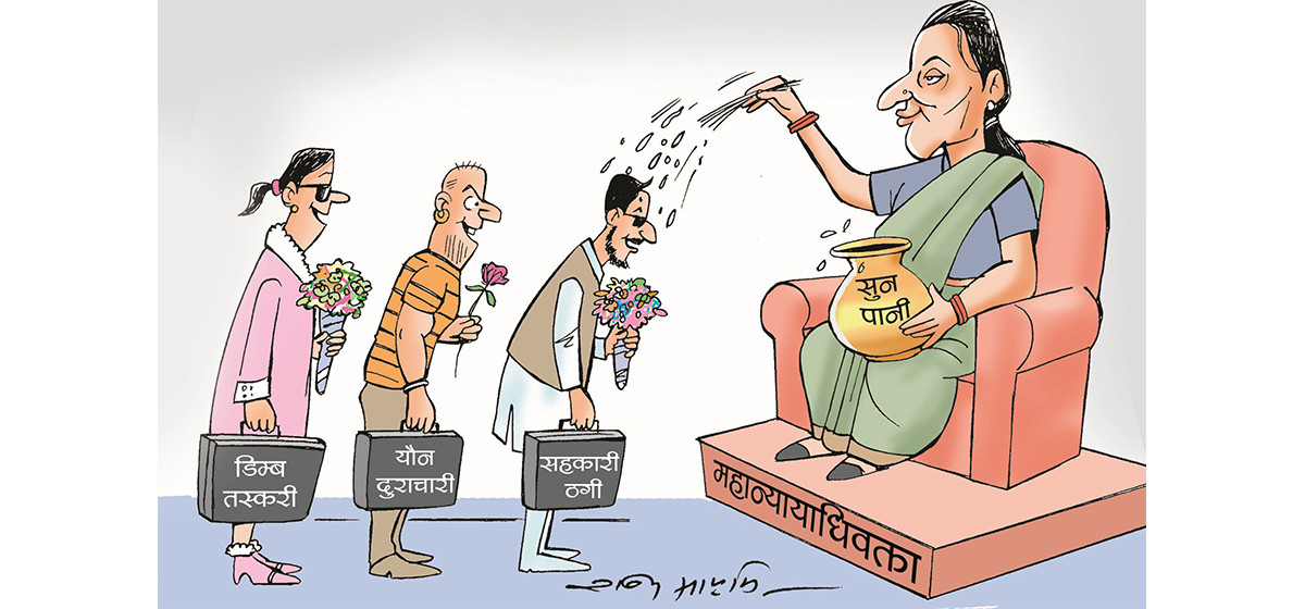रविन साय्मीले तयार गरेकाे ‘आजको कार्टुन’ मा महान्यायाधिवक्ता महाेदयाले डिम्ब तस्करी, यौन दुराचारी र सहकारी ठगीलाई सुनपानीले चोख्याएको व्यङ्ग्यचित्र प्रस्तुत गरिएको छ।