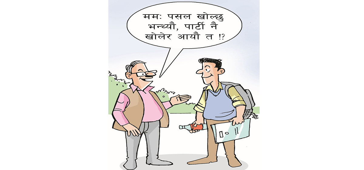 आजकाे कार्टुनले ‘मम: खाेल्छु भन्थ्याै, पार्टी नै खाेलेर आयाै त!’ भनेर सुन्दर ढङ्गले व्यङ्ग्यात्मक रूपमा सामयिक स्वर प्रस्तुत गरेकाे छ।