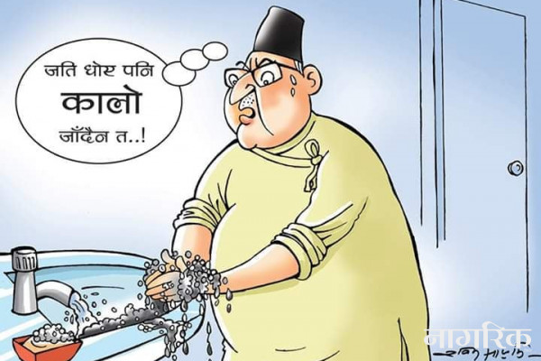 विश्वव्यापी फैलिएको करोना भाइरसका कारण देश लकडाउनमा छ। स्वास्थ्य सामाग्री खरिदमा नियमितता भएका खबर बाहिरिएका छन्। कोरोनाबाट बच्न नियमित सावुनपानीले हात धुनुपर्छ। यसै सन्दर्भमा रविन सायमिले आजको नागरिकमा बनाएको कार्टुन।