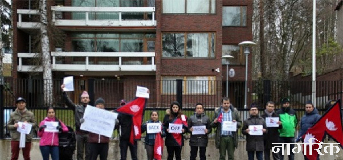 काठमाडौं-भारतीय नाकाबन्दीविरुद्ध फिनल्याण्डमा बस्ने नेपालीहरुले सोमबार भारतीय दुताबास अगाडी प्रदर्शन गरेका छन्। भारतीय विदेश नीतिको बिरोध गर्दै सहभागीले प्ले-कार्ड तथा ब्यानर प्रदर्शन गरेका थिए।नाकाबन्दी हटाई भूपरिवेष्ठित राष्ट्रको पारबहन अधिकारको सम्मान उनीहरुले आग्रह गरे। असल छिमेकीको भूमिका निभाई एक अर्काको आन्तरिक मामिलामा हस्तक्षेप गर्न नहुने भन्दै एनआरएन फिनल्याण्डले ज्ञापनपत्र समेत बुझाएको थियो। पत्र बुझाउने कार्यक्रमका बारेमा अग्रीम जानकारी गराएता पनि राजदुत नभएको तथा ज्ञापनपत्र बुझ्न नसक्ने भन्दै दुताबास कर्मचारीले प्रवेशद्वारबाटै रुखो ब्यबहार देखाएका थिए। पटकपटकको प्रयासपछि दुतावासकी एक कर्मचारीले ढोका नखोली गेटबाटै पत्र बुझेकी थिइन्।