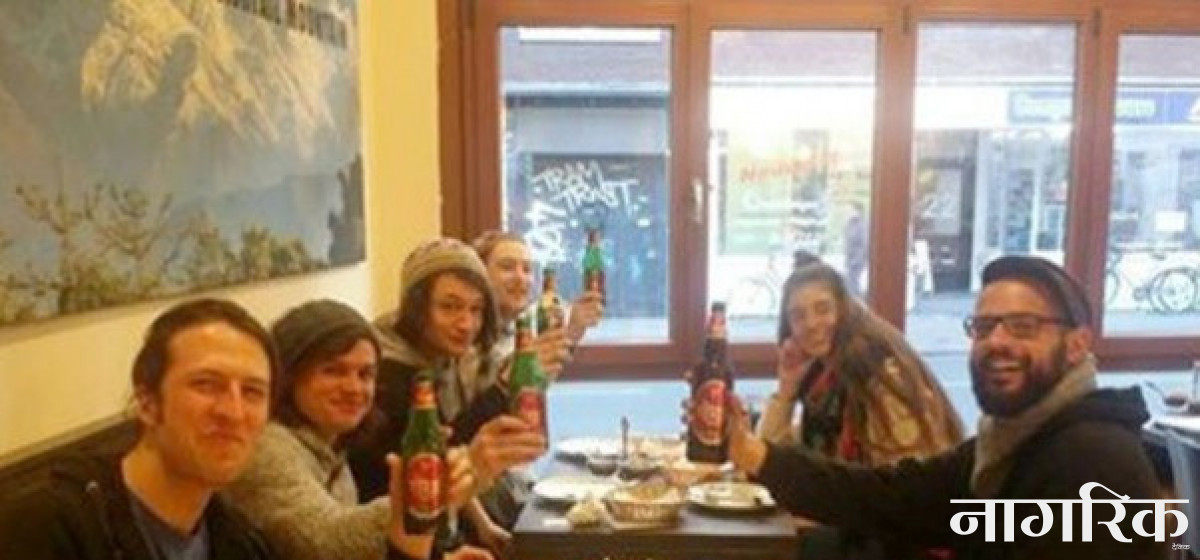 लिटिल बुद्ध रेस्टुरेन्टमा नेपाली बियर पिउँदै जर्मन। तस्बिरः दिलीप पौडेल