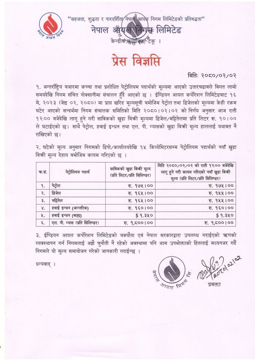 पेट्रोलको मूल्य प्रतिलिटर एक सय ७५, हवाई इन्धन (आन्तरिक) को मूल्य प्रतिलिटर एक सय ६०, हवाई इन्धन (बाह्य) को प्रतिलिटर अमेरिकी डलर १.३५० र खाना पकाउने ग्यासको मूल्य प्रतिसिलिण्डर एक हजार आठ सय कायमै छ।