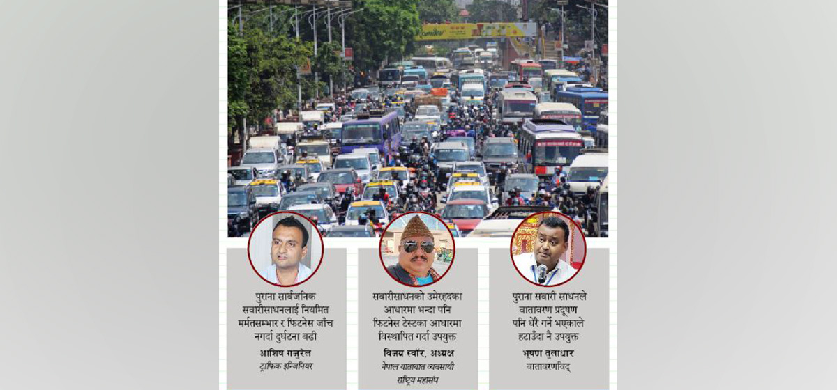 ‘२० वर्ष पुराना सवारीसाधनको इफिसेन्सी र ह्रासकट्टी हुँदै जाने भएकाले पनि नेपालजस्तो जटिल प्रकृतिको भौगोलिक बनोट भएको मुलुकमा त्यति उपयुक्त हुँदैन कि जस्तो लाग्छ,’ उनले भने, ‘पुराना सवारीसाधन धेरै गुडिसकेका छन्। अर्कातर्फ पुराना गाडीले वातावरण प्रदूषण पनि धेरै गर्ने भएकाले हटाउँदा नै उपयुक्त हुन्छ जस्तो लाग्छ।’ वातावरणविद् तुलाधारले फिटनेस टेस्टमा फेल हुने सवारीसाधनलाई पनि प्रतिबन्ध लगाउनुपर्ने बताए।