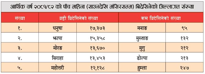 बैदेसिक रोजगार विभागका अनुसार सबैभन्दा धेरै बैदेसिक रोजगारीका लागि जानेमा धनुषा पहिलो स्थानमा छ भने सबैभन्दा कम मनाङ रहेको छ। चालु आवको साउनदेखि मंसिरसम्ममा धनुषाबाट १७ हजार तीन सय ७३ जना र हिमाली जिल्लाको मनाङबाट ९५ जनाले मात्रै विभागबाट श्रम स्वीकृति लिएर बिदेसिएका छन्।