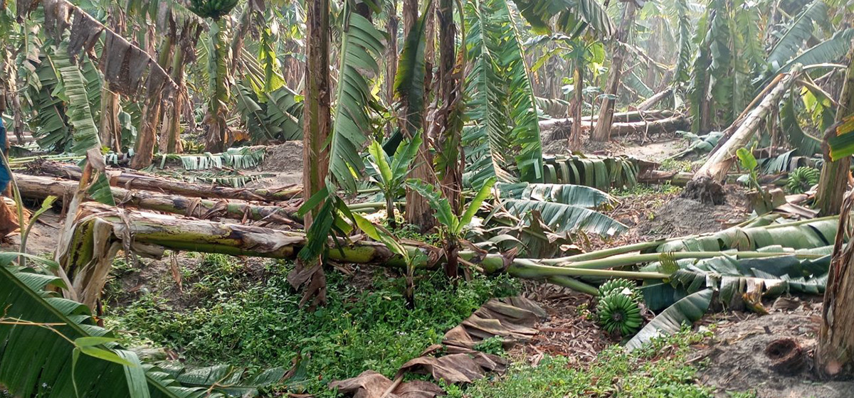 गत आइतबार राति र सोमबार साँझको हुरीबतासले खेतमा लगाएको केराको बोट ढलेर ठूलो क्षति भएको छ। स्थानीय किसानले ऋण लिएर गरेको केराखेतीमा एकैपटक यस्तो ठूलो हावाहुरी आएकाले लाखौँको लगानी डुबाउनेगरी क्षति भएको गुनासो स्थानीय किसानले गरेका छन्।