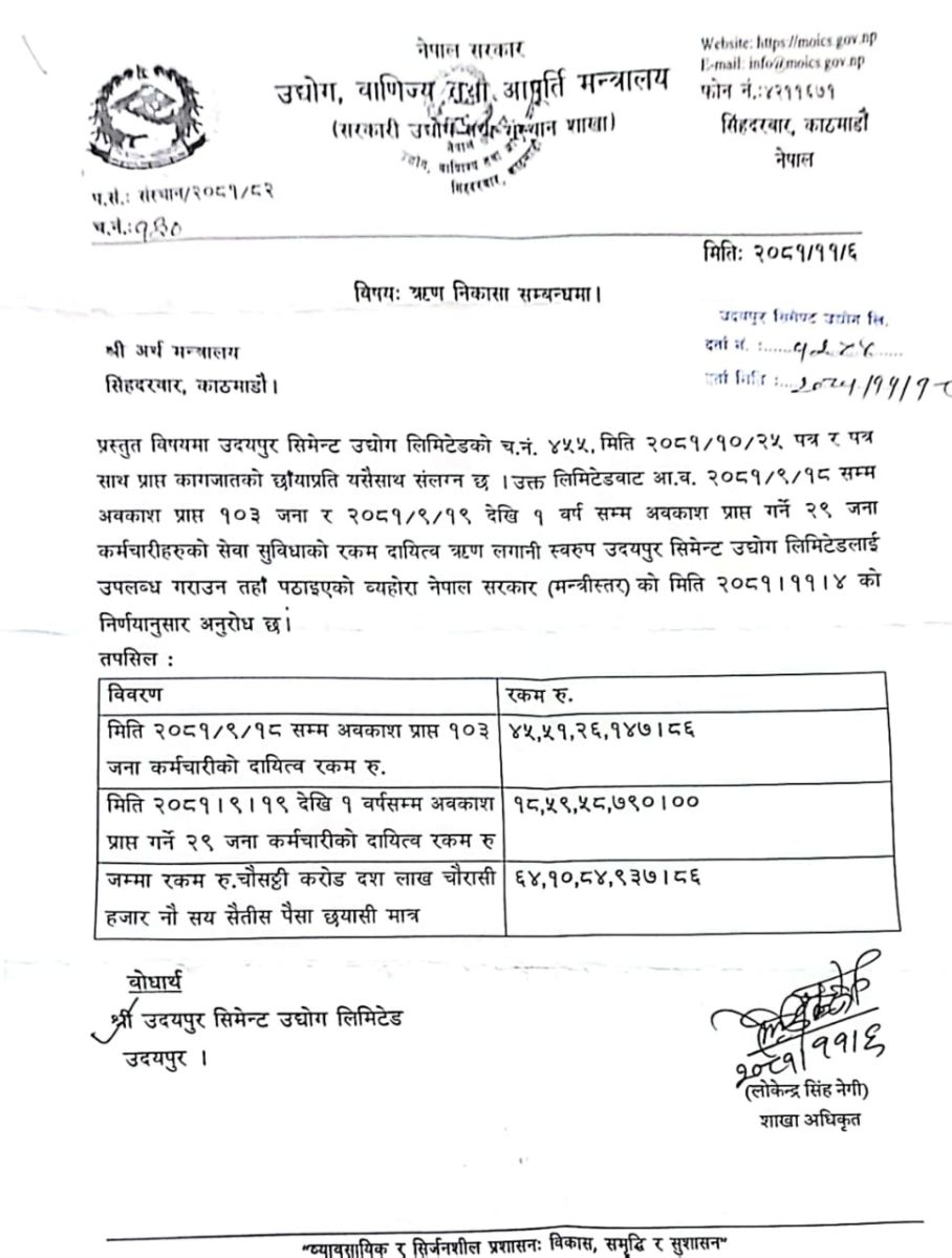 तीन वर्षदेखि घाटामा गएको उद्योगलाई सञ्चालन गर्न माओवादी अध्यक्ष पुष्पकमल दाहाल नेतृत्वको सरकारले ०८० चैतमा १६ करोड ऋण अनुदान दिएको थियो। त्यसबाट उद्योग मर्मत गरी बाँकी ११ करोडमध्ये ५ करोड आन्तरिक ऋण लिएर सञ्चालन गरिएको हो। १२ दिनको कच्चा पदार्थले उद्योग दुई सातामा एक महिनाको तलब, विद्युत् महसुल र ५ करोड ऋण तिर्न पुग्ने सिमेन्ट उत्पादन भएको छ।