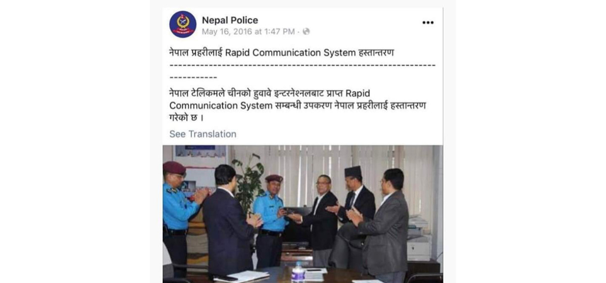 २०७३ मा चीन सरकारले ५० थान र्यापिड कम्युनिकेसन सिस्टम नेपाल टेलिकमलाई दिएको थियो। चिनियाँ कम्पनी हुवावे टेक्नोलोजिजले उत्पादन गरेको उक्त सिस्टम नेपाल टेलिकमले नेपाल प्रहरीलाई हस्तान्तरण गरेको थियो। चीनका राष्ट्रपति सी चिनफिङ नेपाल भ्रमणमा आएका बेला प्रहरीले उक्त सिस्टम प्रयोगमा ल्याए पनि पछि त्यसको प्रयोग भएको छैन।