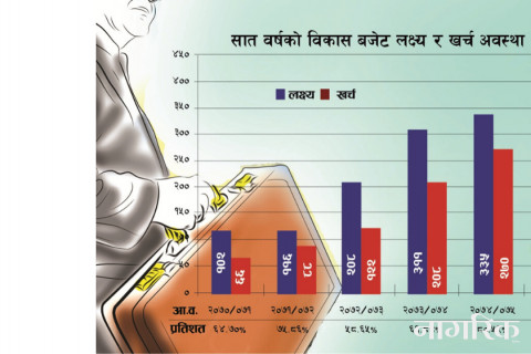 सरकारले चालु आवलाई विकास बजेट चार खर्ब ८ अर्ब रुपैयाँ छुट्याएको छ। आव सकिन एक महिना बाँकी हुँदा एक खर्ब २६ अर्ब रुपैयाँ मात्र खर्च भएको छ। यो लक्ष्यको तुलनामा ३० प्रतिशत हो। आयोजना सञ्चालन र खर्च गर्ने प्रणाली सुधार नगरेसम्म यथार्थ योभन्दा भिन्न हुनेछैन।
