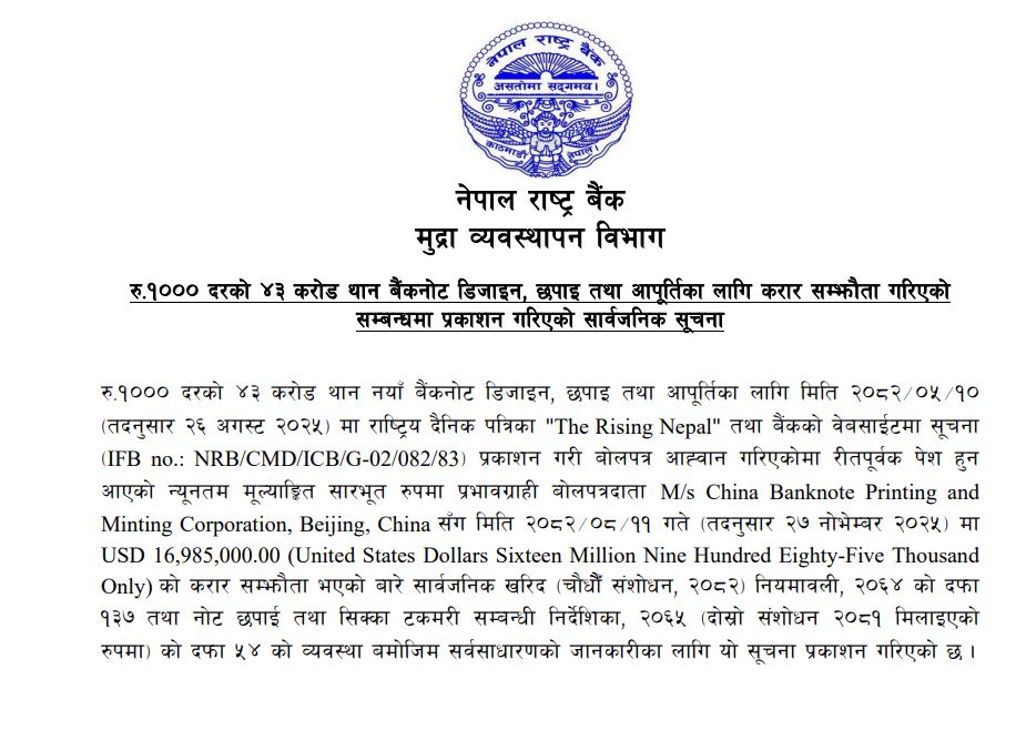 चिनियाँ कम्पनीले १ करोड ६९ लाख ८५ हजार अमेरिकी डलरमा नोट छाप्ने ठेक्का पाएको हो।