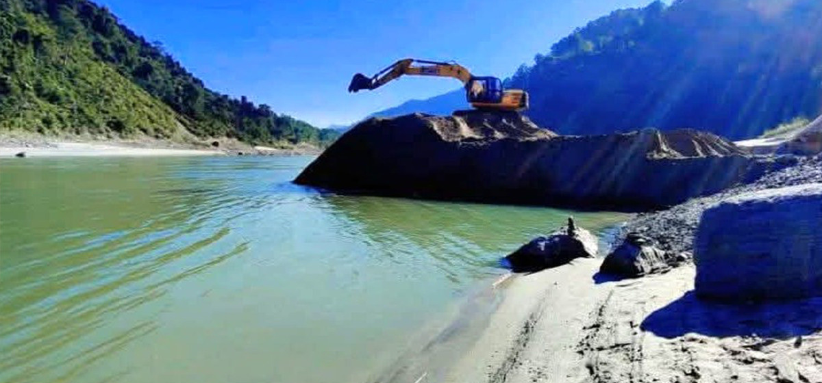बेलीब्रिज बनाउन नदीको बहाव साँघुरो पारिँदै। तस्बिरः महेश्वर