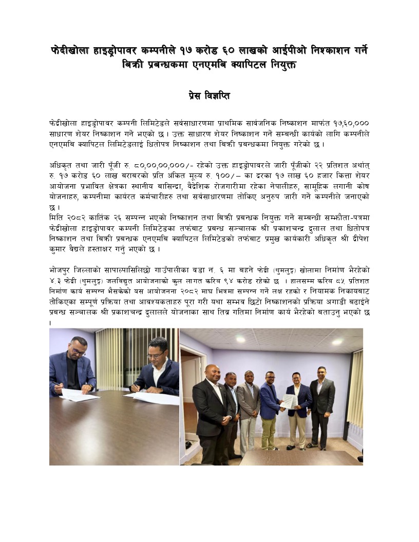 बुधबार सम्पन्न भएको निष्कासन तथा बिक्री प्रबन्धक नियुक्त गर्ने सम्बन्धी सम्झौता–पत्रमा फेदीखोला हाइड्रोपावर कम्पनी लिमिटेडका तर्फबाट प्रबन्ध सञ्चालक प्रकाशचन्द्र दुलाल तथा धितोपत्र निष्कासन तथा बिक्री प्रबन्धक एनएमबि क्यापिटल लिमिटेडको तर्फबाट प्रमुख कार्यकारी अधिकृत दीपेशकुमार वैद्यले हस्ताक्षर गरेका छन्।