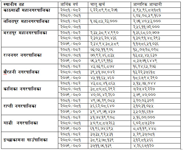 बागमती प्रदेशका केही स्थानीय तहको आन्तरिक आम्दानी र चालु खर्च