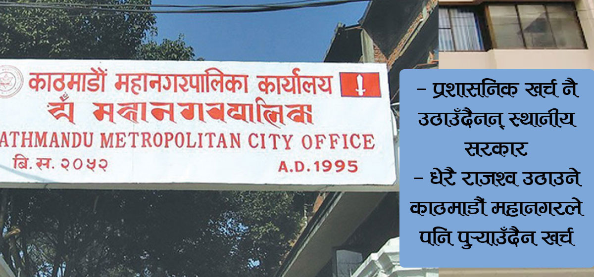 दैशकै सबैभन्दा धेरै आन्तरिक राजस्व संकलन गर्ने काठमाडौं महानगरपालिकालेसमेत आफ्नो आन्तरिक आम्दानीले चालु खर्च धान्न सकेको छैन । आन्तरिक आम्दानीभन्दा चालु खर्च २६ करोड ९३ लाख ११ हजार रुपैयाँ बढी रहेको महानगरको तथ्यांकमा उल्लेख छ । गत आर्थिक वर्ष २०८१/०८२ मा महानगरले आन्तरिक राजस्वतर्फ ५ अर्ब ९५ करोड ९६ लाख ८७ हजार १८१ रुपैयाँ राजस्व संकलन गरेको थियो । उसको प्रशासनिक तथा सेवा (चालु खर्च) तर्फ ६ अर्ब २२ करोड ८९ लाख ९८ हजार २७१ रुपैयाँ खर्च भएको छ ।