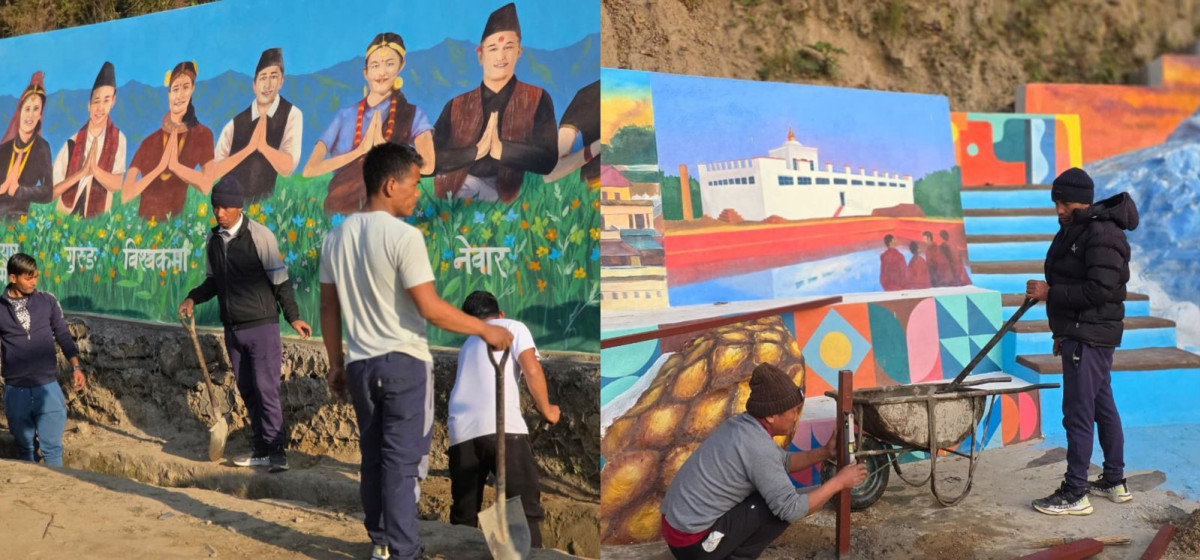 क्याप्सनः साकेला प्रवेशद्वारमा निर्मित चित्रकला र श्रमदानमा खट्दै अध्यक्षलगायत । तस्विरः महेश्वर