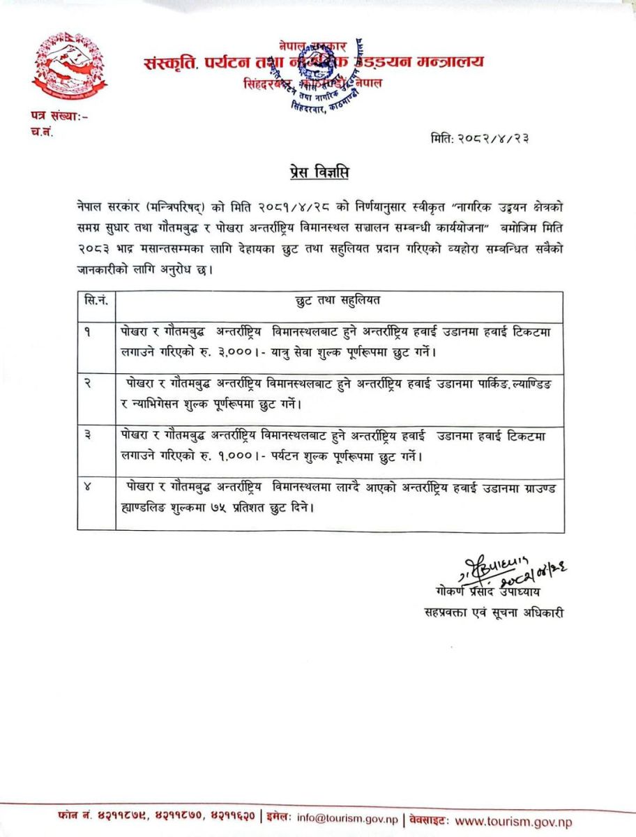 विज्ञप्तिमा नेपाल सरकार(मन्त्रिपरिषद्)ले २०८१ साउन २८ गते स्वीकृत गरेको ‘नागरिक उड्डयन क्षेत्रको समग्र सुधार तथा गौतम बुद्ध र पोखरा अन्तर्राष्ट्रिय विमानस्थल सञ्चालन सम्बन्धी कार्य योजना’ बमोजिम २०८३ भदौ मसान्तसम्मका लागि यो छुट सहुलियत सुविधा ल्याएको उल्लेख छ।
