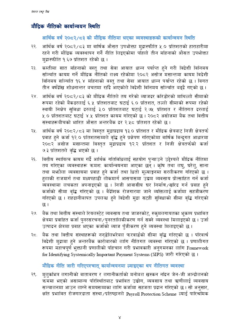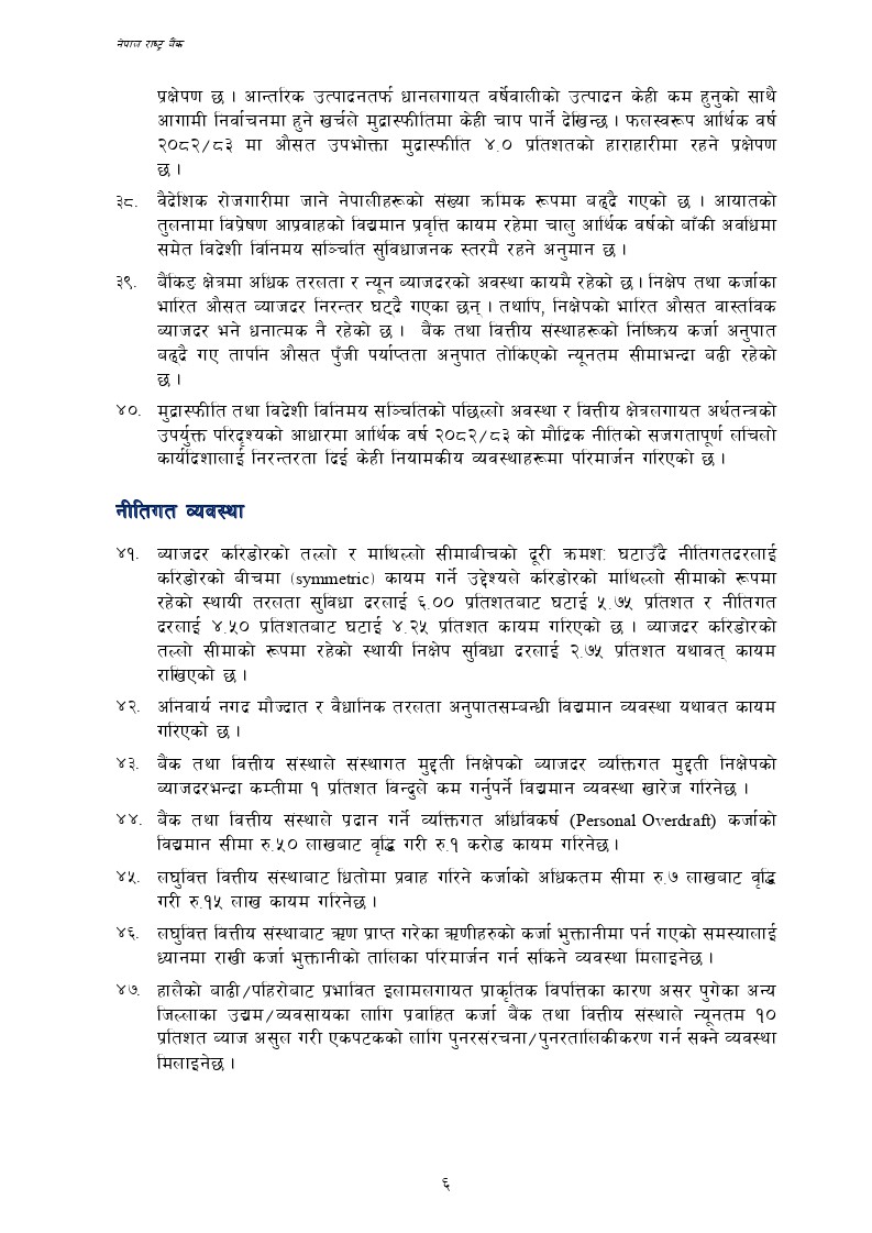व्यक्तिगत ओभरड्राफ्टको सीमा ५० लाखबाट बढाएर एक करोड रुपैयाँ कायम गरिएको छ। स्थायी तरलता सुविधा दर ६ प्रतिशतबाट घटाएर ५.७५ प्रतिशत र नीतिगत दर ४.५० प्रतिशतबाट घटाएर ४.२५ प्रतिशत बनाइएको छ। निक्षेप संकलन दर २.७५ प्रतिशतमा यथावत् छ।