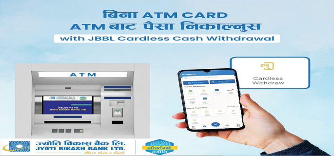 ज्योति विकास बैंकले डेबिट कार्ड बिना नै एटिएमबाट पैसा निकाल्न सक्ने कार्डलेस भुक्तानी सेवाको सुरुआत गरेको छ।