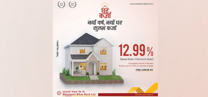 महालक्ष्मी विकास बैंकले १२.९९ प्रतिशत ब्याजदरमा आवास र व्यावसायिक कर्जा दिने घोषणा गरेको छ।