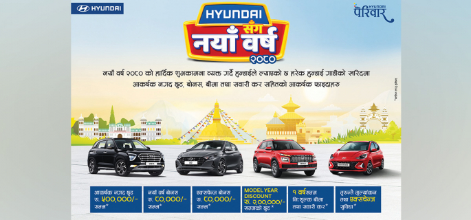 लक्ष्मी इन्टरकन्टिनेन्टल, हुन्डाई अटोमोवइल्सको आधिकारिक बिक्रेताले नेपाली नयाँ वर्षलाई मध्यनजर गर्दै ‘हुन्डाईसँग नयाँ वर्ष २०८०’ योजना ग्राहक माझ ल्याएको छ।