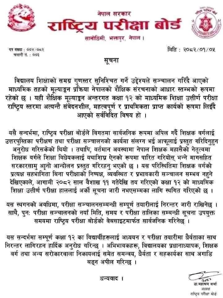 ११ वैशाखदेखि सुरु हुने भनिएको कक्षा १२ को परीक्षा स्थगित भएको भन्दै सामाजिक संजालमा एउटा सूचना प्रेसित भइरहेको छ। तर उक्त सूचना बोर्डको नभएको बताइएकाे छ।