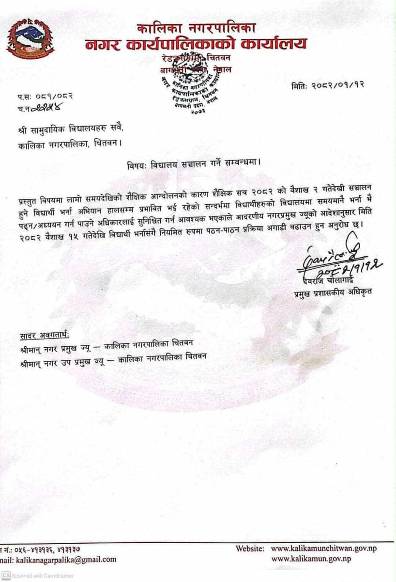 चितवनको कालिका नगरपालिकाले सामुदायिक विद्यालयलाई कक्षा सञ्चालन गर्न निर्देशन दिएको छ । नगरपालिकाका प्रशासकीय अधिकृत देवराज चौलागाईले आज (शुक्रबार) एक विज्ञप्ती जारी गर्दै सामुदायिक विद्यालय विद्यालयका शिक्षकलाई कक्षा सञ्चालन गर्न निर्देशन दिएका हुन् ।