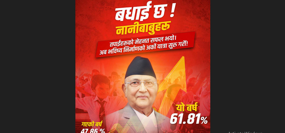 अगाडि उनले भनेका छन्, 'एसईई परीक्षामा ग्रेड प्राप्त गर्नुभएका भाइबहिनीहरूलाई हार्दिक बधाई ! यस वर्ष करिब ६१.८१ प्रतिशत परीक्षार्थीले ग्रेड प्राप्त गर्नुभएको छ। गत वर्ष ४७.८६५ प्रतिशत परीक्षार्थीले मात्र ग्रेड प्राप्त गर्नु भएको थियो भने ५२.१४ प्रतिशत परीक्षार्थी नन ग्रेडेट रहनु परेको थियो । बितेको वर्षमा नतिजा सुधार गर्न हामीले गरेको मेहनत काम लागेको छ।'
