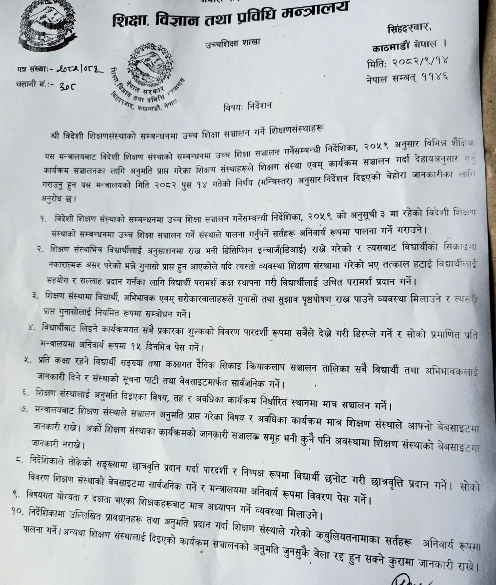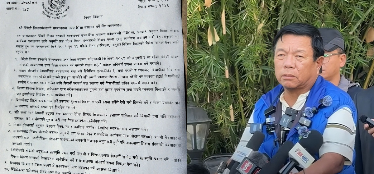 शिक्षामन्त्री महावीर पुनले विदेशी विश्वविद्यालयको सम्बन्धनमा नेपालमा सञ्चालित कलेजहरूलाई १० बुँदे कडा निर्देशन जारी गरेका छन्। केही कलेजहरूले निर्देशिका उल्लङ्घन गरी विद्यार्थीलाई गुणस्तरीय सेवा नदिएको गुनासो आएपछि मन्त्रालयले यस्तो निर्देशन जारी गरेको हो।