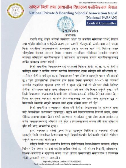 निजी विद्यालयलाई ‘क, ख, ग, घ’ श्रेणीमा वर्गीकरण गर्दै सरकारले शुल्क स्वीकृत गर्ने गरेको उल्लेख गर्दै उनीहरुले सोही अनुसार विद्यालयहरूले १० प्रतिशत छात्रवृत्ति प्रदान गर्दै आएको बताए।