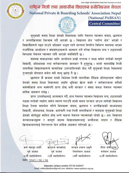 जारी विज्ञप्तिमा नयाँ विद्यालय शिक्षा ऐनका प्रावधानहरूमा आवश्यक संशोधन गर्दै यसलाई सबै सरोकारवालाको साझा दस्ताबेज बनाउन सरकारलाई पुनः आग्रह गरिएको छ।