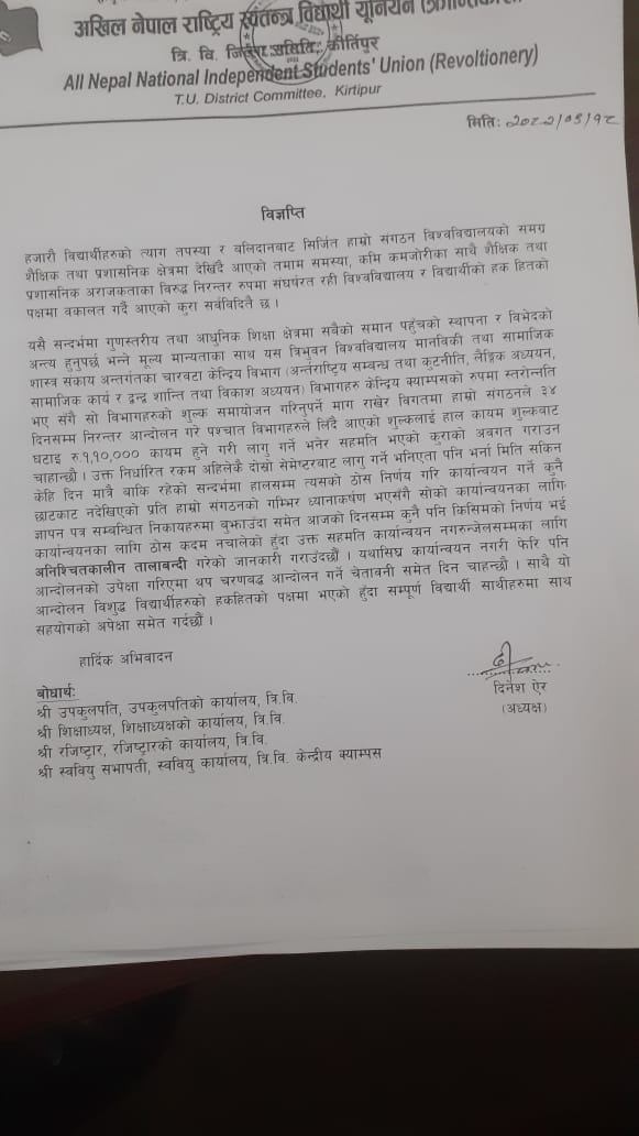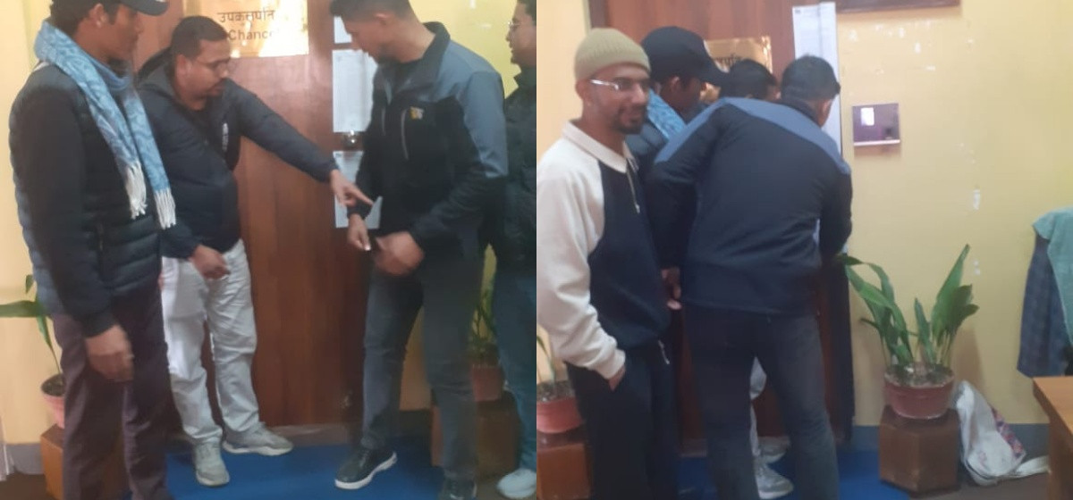 त्रिभुवन विश्वविद्यालयका पदाधिकारीले विद्यार्थीसँग गरेको शुल्क समायोजनको सहमति कार्यान्वयनको माग गर्दै क्रान्तिकारी विद्यार्थीले विश्वविद्यालयका पदाधिकारीको कार्यकक्षमा अनिश्चितकालीन तालाबन्दी गरेका छन्।