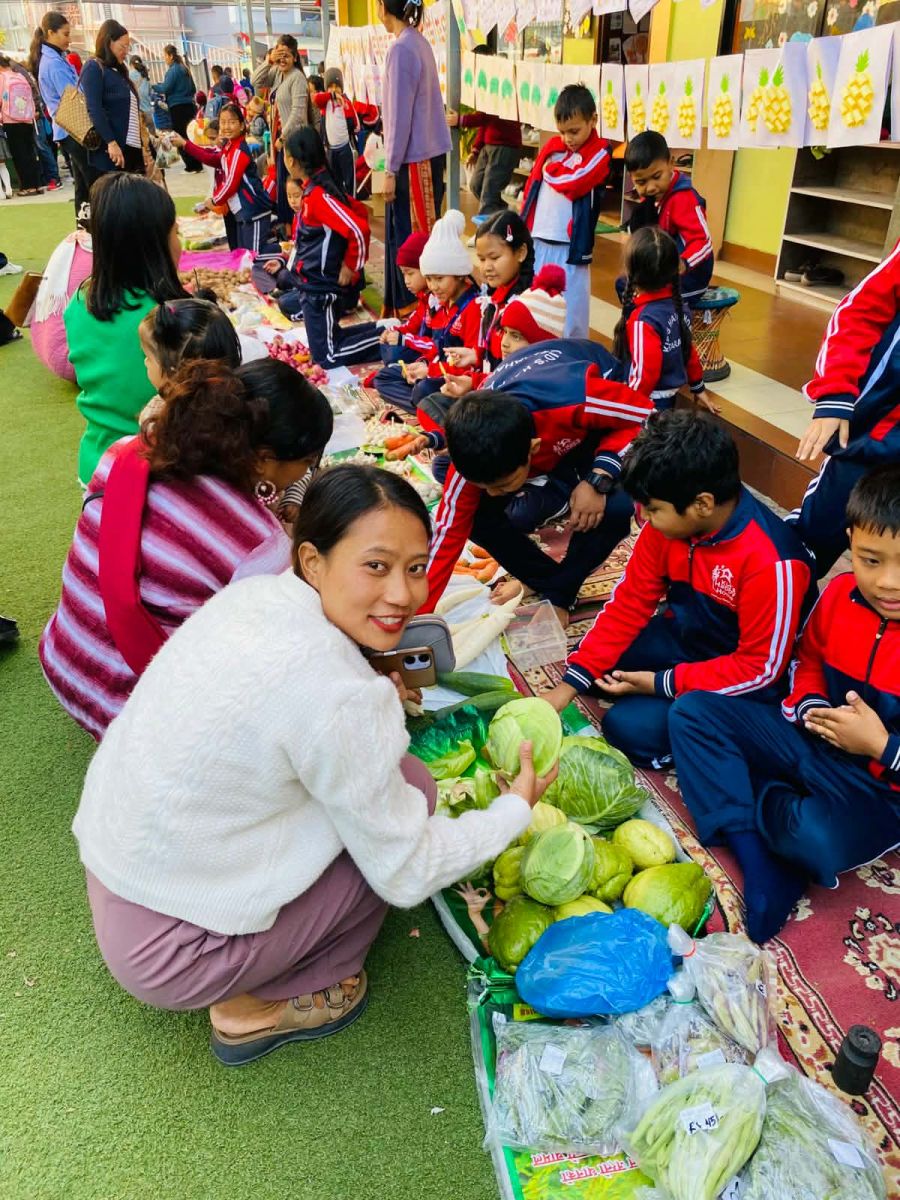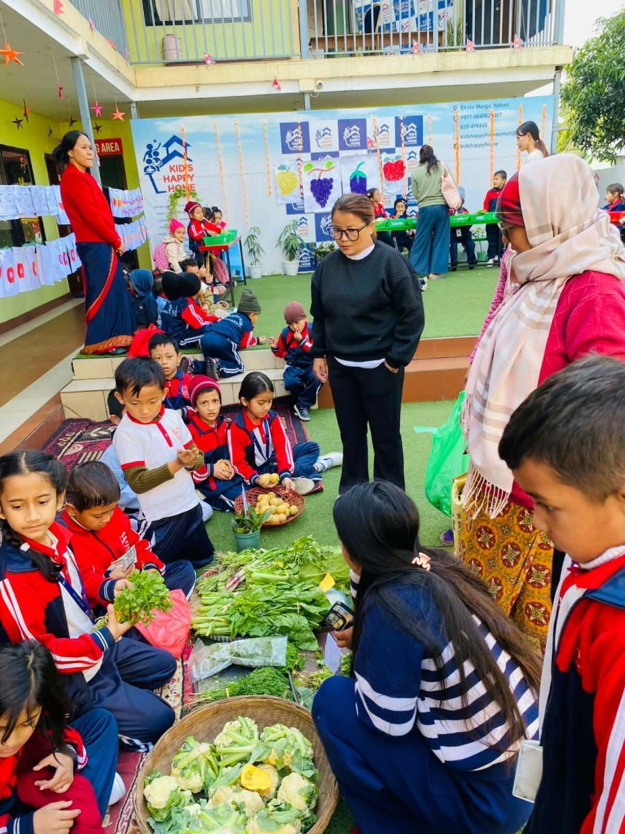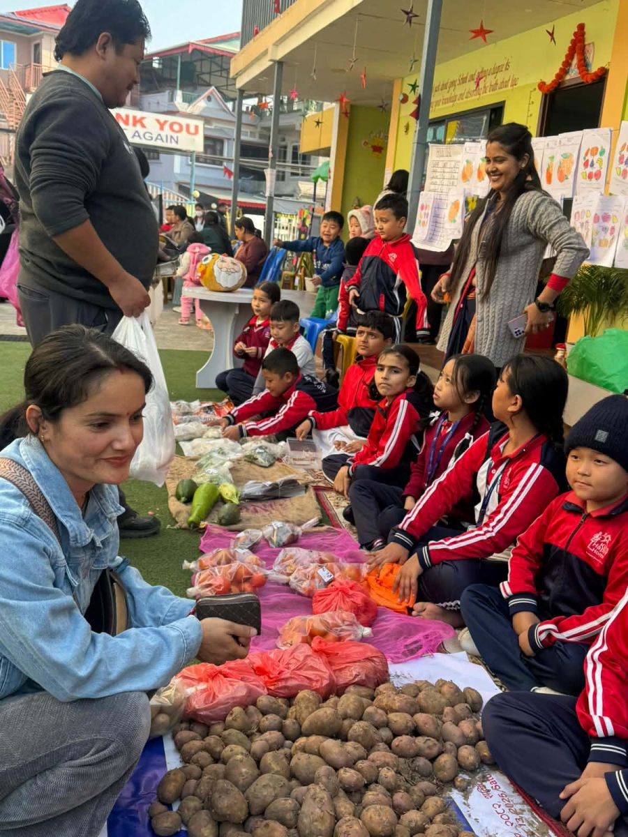 सधैं किताब र कापीमा व्यस्त रहने विद्यार्थीहरू मंगलबार भने तरकारी व्यापारीको रूपमा स्कुल परिसरमै तराजु र ढक लिएर बसेका थिए।