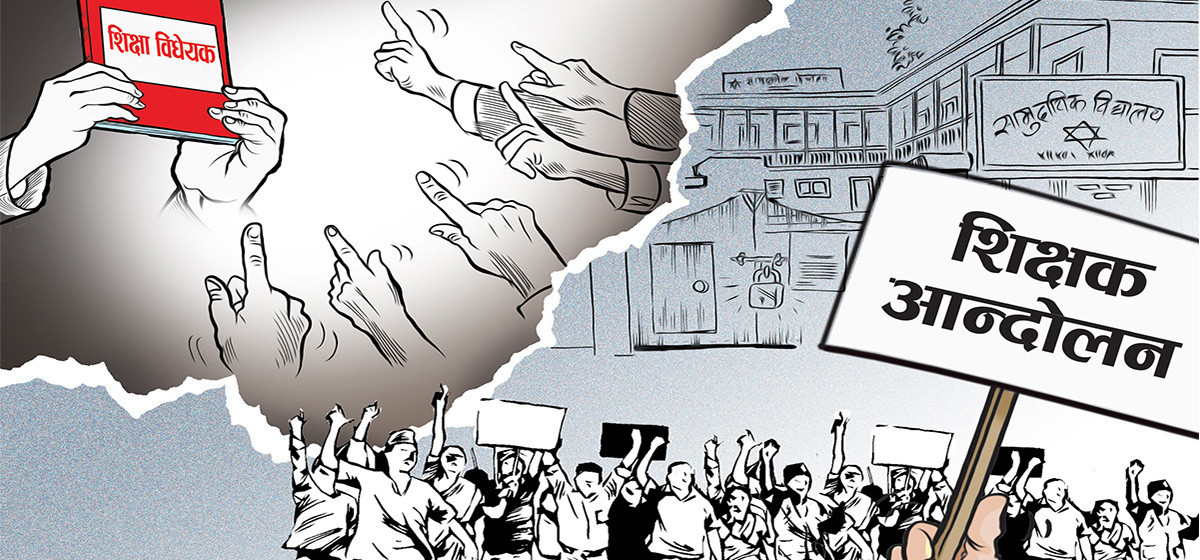 उनले थपे, ‘म्याद सकिएको अध्यापन अनुमतिपत्रको नवीकरण, विद्यालय कर्मचारीको स्थायित्व, बालकक्षा शिक्षकको सेवा, संस्थागत विद्यालयका शिक्षकको सुरक्षा, द्वन्द्वपीडित शिक्षकको उपदान विधेयकले समेटेको छैन। शिक्षक दरबन्दी स्थानीय तहमा हस्तान्तरणको व्यवस्था महासंघलाई मान्य हुँदैन।’