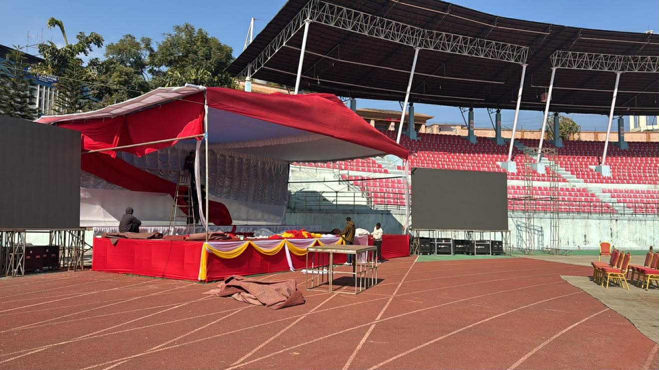 बुधबार रंगशाला पुगेर उनले मञ्च व्यवस्थापन, स्वागतद्वार निर्माण र सुरक्षा प्रबन्धको निरीक्षण गरे।
