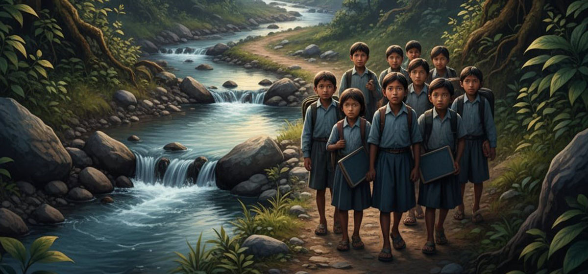 महाकाली नदी किनार जङ्गलको बाटो हिँड्नुपर्ने भएकाले यहाँका विद्यार्थी समूह बनाएर विद्यालय आउने जाने गर्छन्। उक्त बस्तीदेखि विद्यालयसम्म पुग्न १३ खोला तर्नुपर्छ। हिउँदमा अटोरिक्सा र मोटरसाइकल चले पनि बर्खाको समयमा बाढीपहिराले पूर्ण रूपमा सडक बन्द हुँदा यहाँका विद्यार्थी पढ्नबाट वञ्चित हुने गरेका छन्।