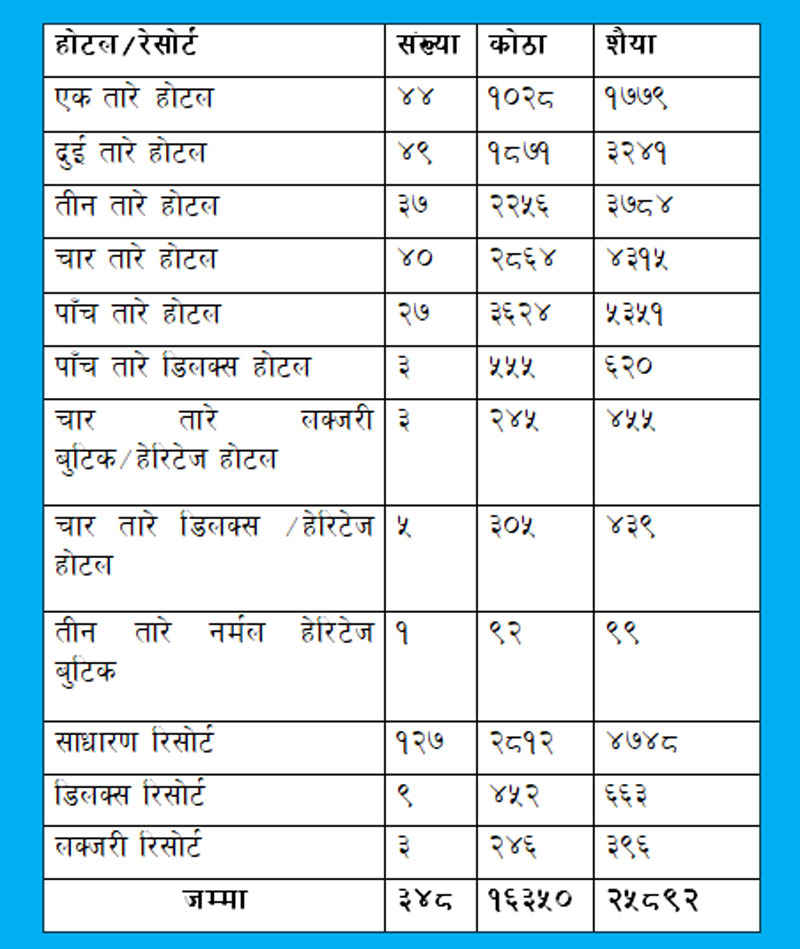 यस्तै फाइभ स्टार होटल २७ वटा खुलेकामा तीन हजार छ सय २४ वटा कोठा छन् । त्यहाँ पाँच हजार तीन सय ५१ शैया संख्या छ भने पाँच तारे डिलक्स स्तरका होटल पनि तीन वटा खुलेको र तिनमा पाँच सय ५५ कोठा छन् । यिनमा छ सय २० शैया रहेको पर्यटन विभागको तथ्यांकमा उल्लेख छ ।